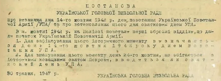 «День 14 жовтня, що збігається з історичним козацьким святом Покрови, засновується як святковий день УПА», — йшлося в цій постанові.